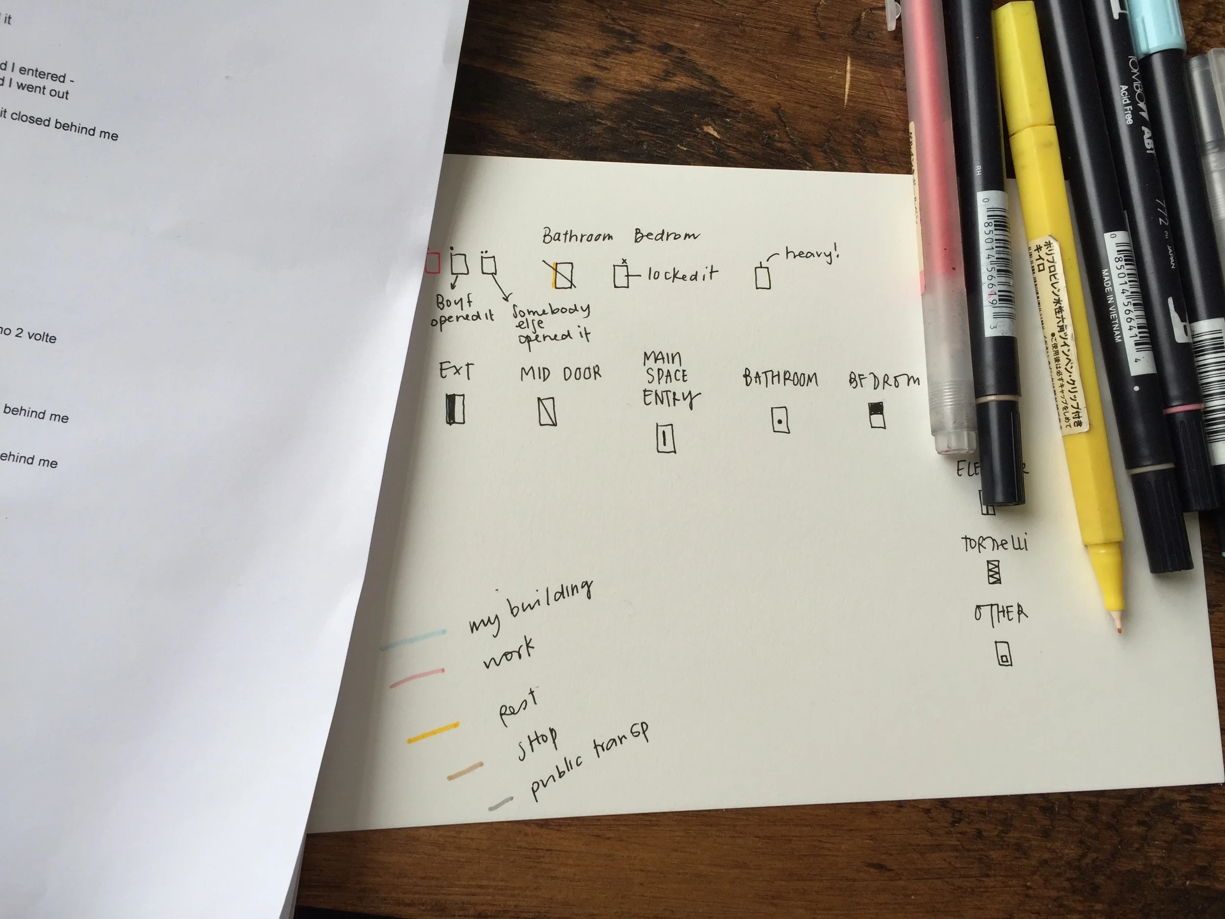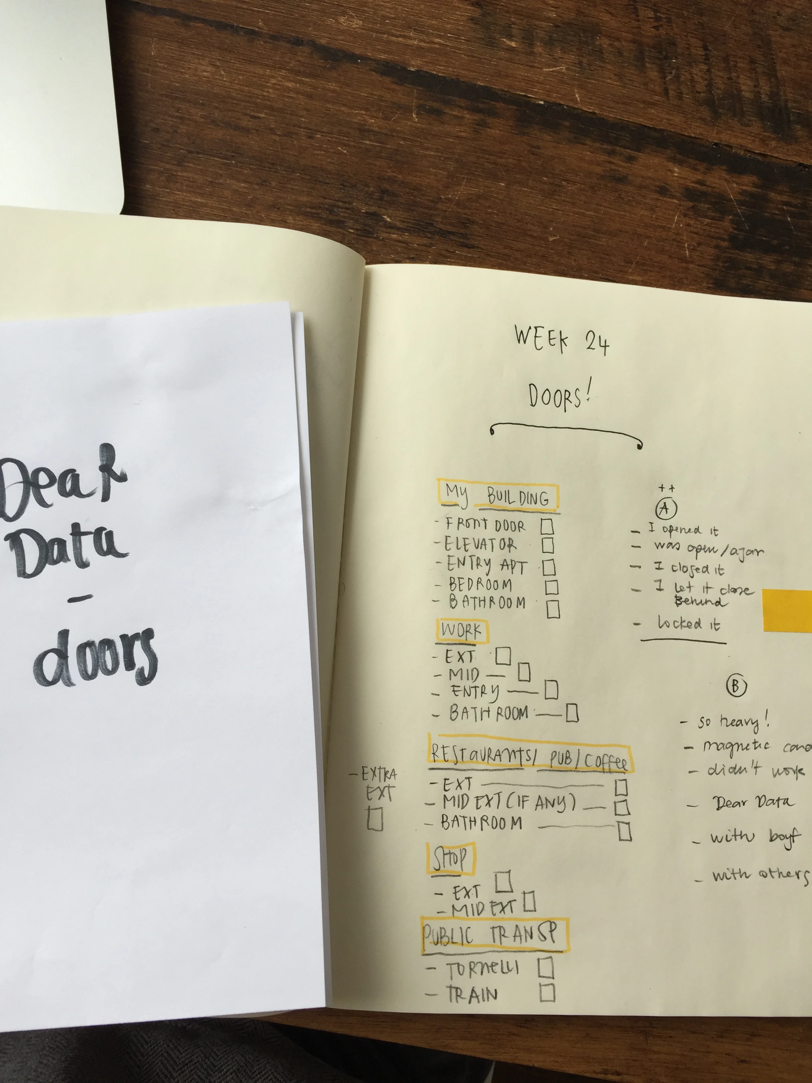 Gathering data on every door that we went through is obviously an idea that we had at the beginning of the project before we actually started to gather and draw data, and you can tell this by how ridiculously insane and complicated it is to actually gather such fine-grain data about one’s life. Oh, how optimistic we were then, in those early days!