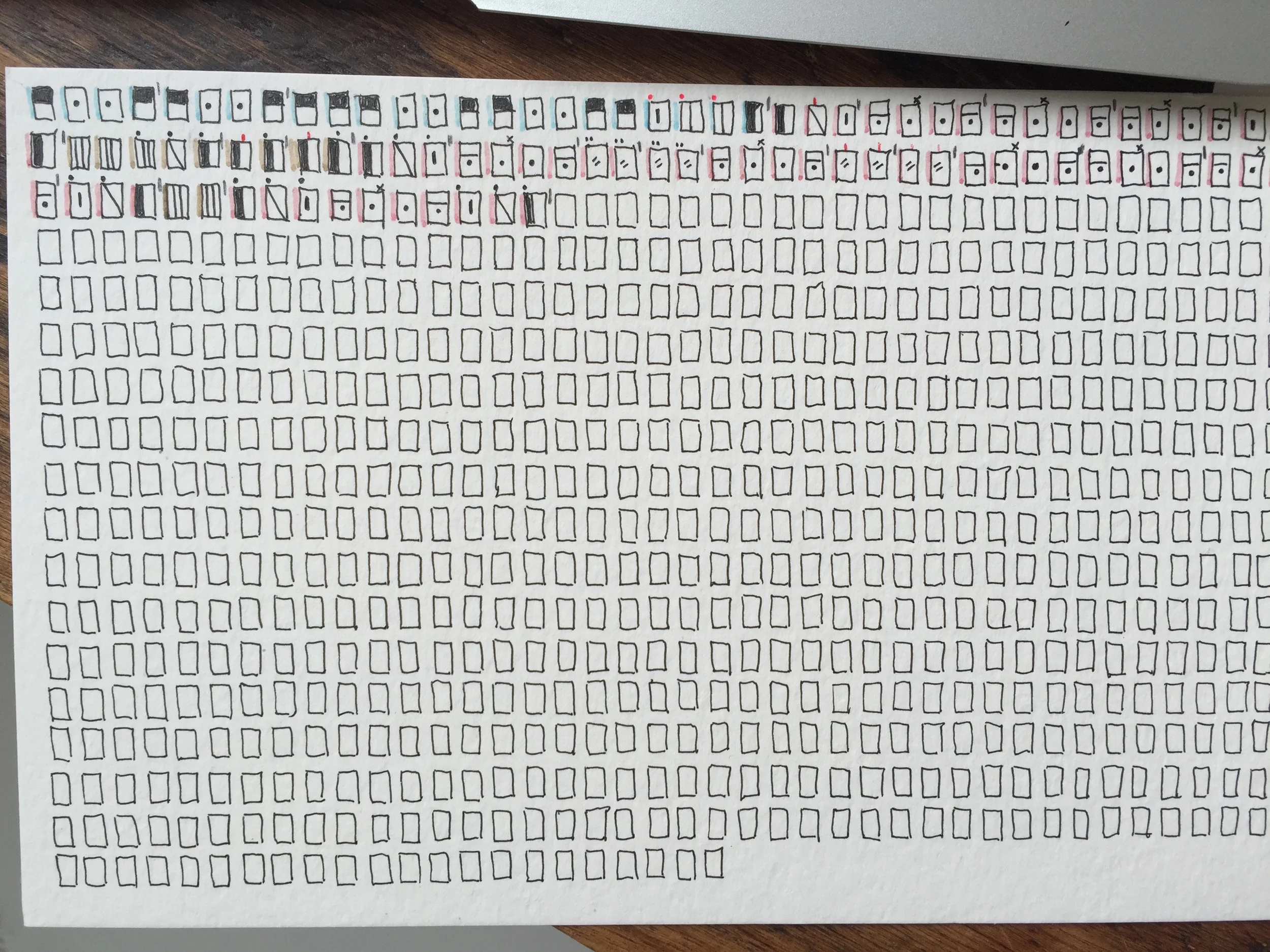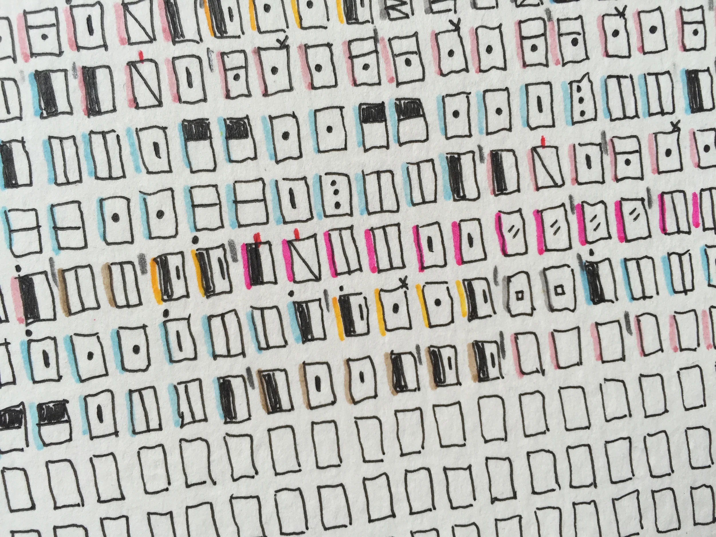 As much as I was happy about the idea in the beginning, I regretted it while drawing it: it took me forever! And my hand was hurt in the end! But I like the result I admit, it is very structured and reminds me to tiny floor-plans…!