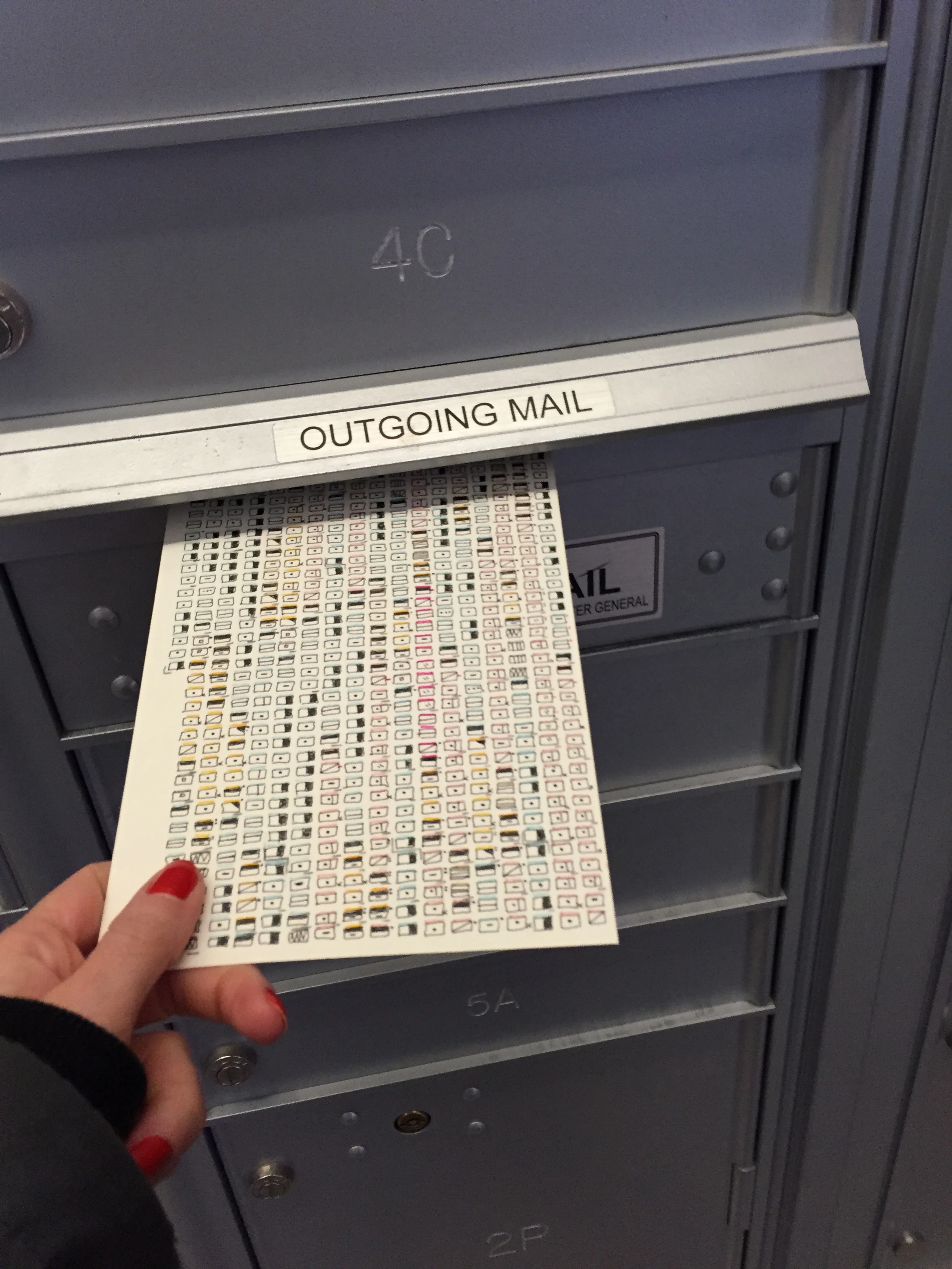 I LOVE Stefanie’s card - it is beautiful and very original, I love the colors she chose and the ways she depicted the different kind of doors she passed through. She detailed the data collection much more than me this time, and I lost myself tracking her days: from her personal space to her studio, to her doctor’s office to her friend’s houses!