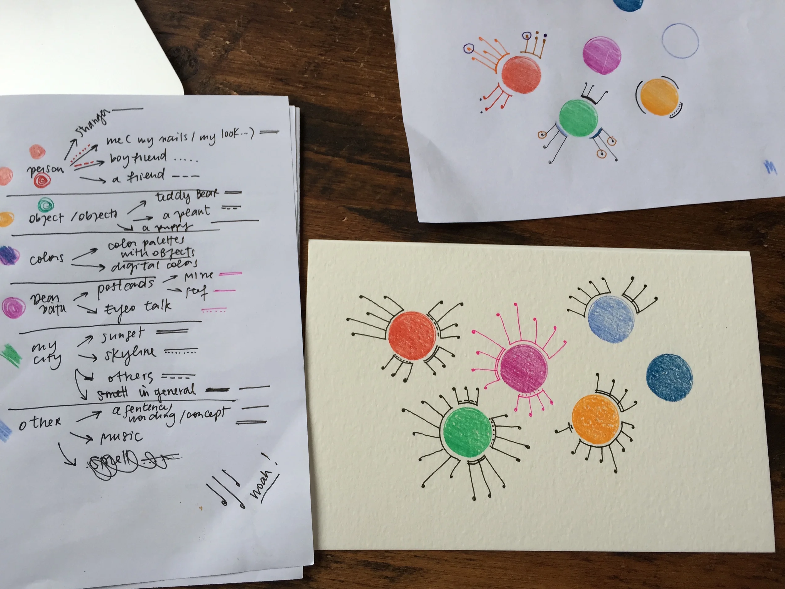 In my postcard every colored circle represents one of the classifications above, and every line is a singular entry, with its length indicating the level of engagement I felt, and with the type of line illustrating the sub-categories.