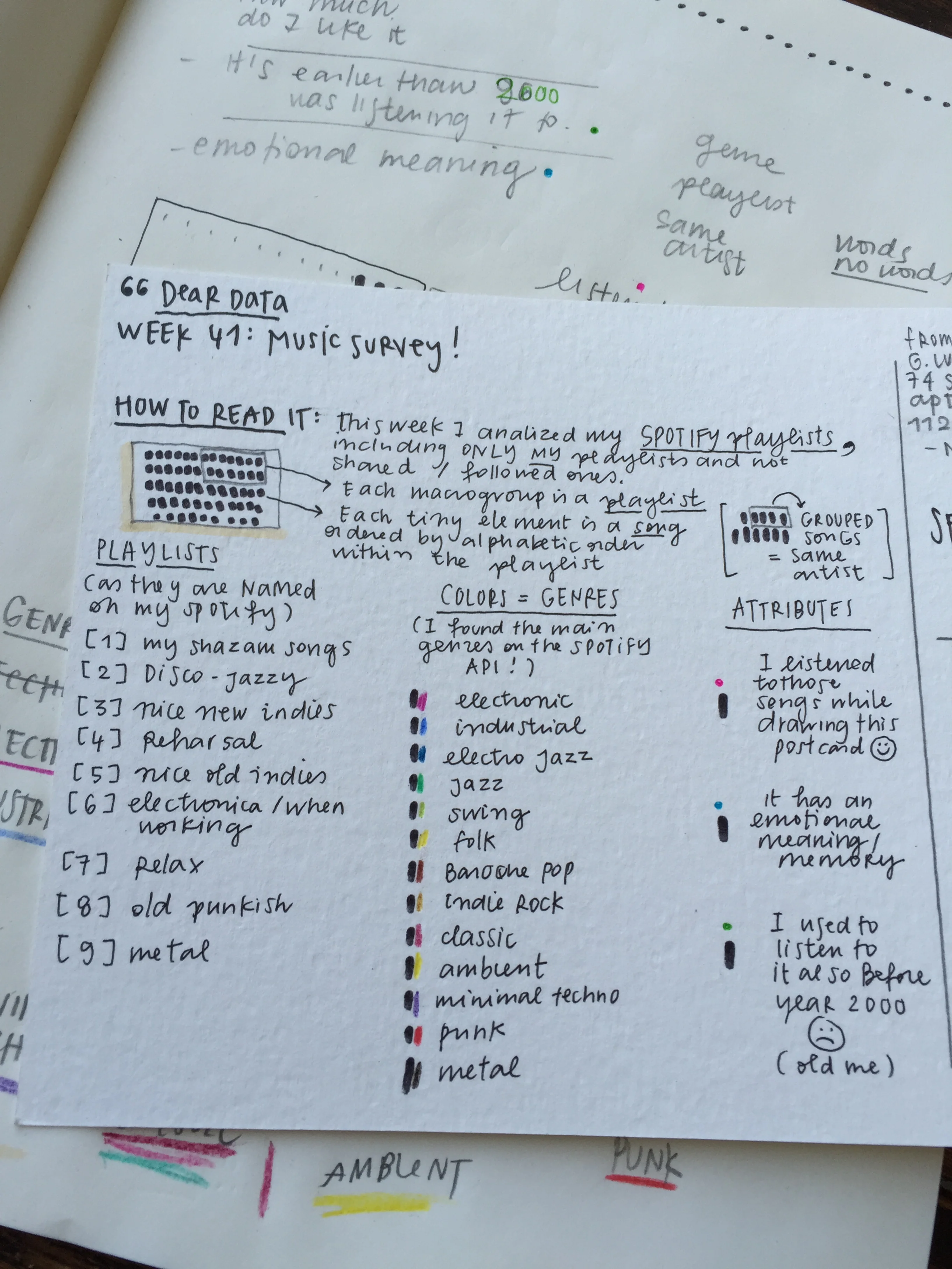 After many flips back and forth, I put her card on my precious Dear Data postcards container, and I followed Stefanie on Spotify: for the first time in 41 weeks having access to the real information she symbolized with her card.